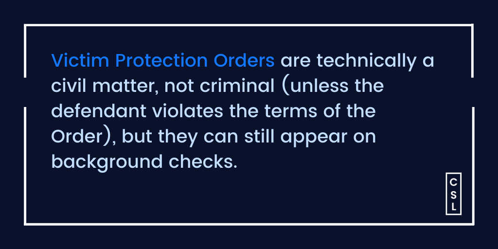 Victim Protection Orders are technically a civil matter, not criminal (unless the defendant violates the terms of the Order), but they can still appear on background checks.